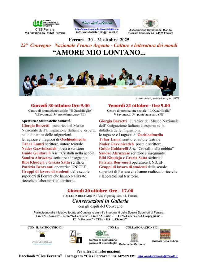 Cies Ferrara e Associazione Cittadini del mondo promuovono la 23^ edizione del Convegno Nazionale Franco Argento. Culture e letteratura dei Mondi, che si avvale del Patrocinio del Comune di Ferrara e della collaborazione con MEI- Museo Nazionale dell’Emigrazione Italiana, Galleria del Carbone, Associacione Cristalli nella nebbia, Centro di promozione sociale “Il quadrifoglio”.