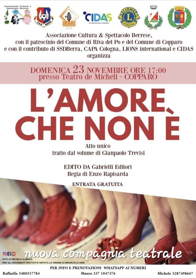 Domenica 23 novembre, ore 17 presso Teatro de Micheli, Copparo, Associazione Cultura & Spettacolo Berrese, con il patrocinio del Comune di Riva del Po e del Comune di Copparo e con il contributo di SSDBerra, CAPA Cologna, LIONS International e CIDAS organizza “L’amore che non è” – Atto Unico tratto dal volume di Gianpaolo Trevisi.