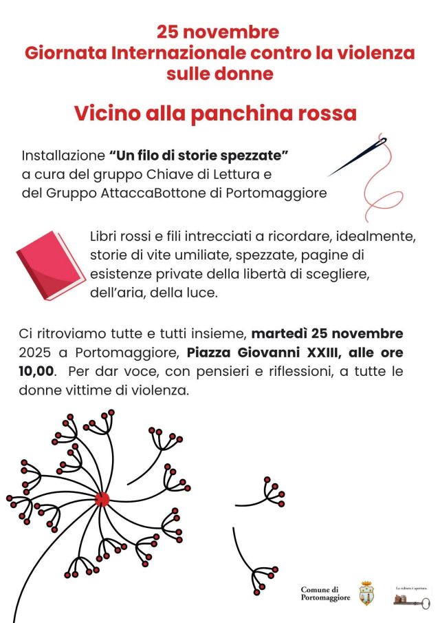 Martedì 25 novembre, ore 10 in Piazza Giovanni XIII a Portomaggiore, installazione “Un filo di storie spezzate” a cura del gruppo Chiave di Lettura e del Gruppo Attacca Bottone di Portomaggiore: appuntamento tutti insieme per dare voce, con pensieri e riflessioni, a tutte le donne vittime di violenza.
