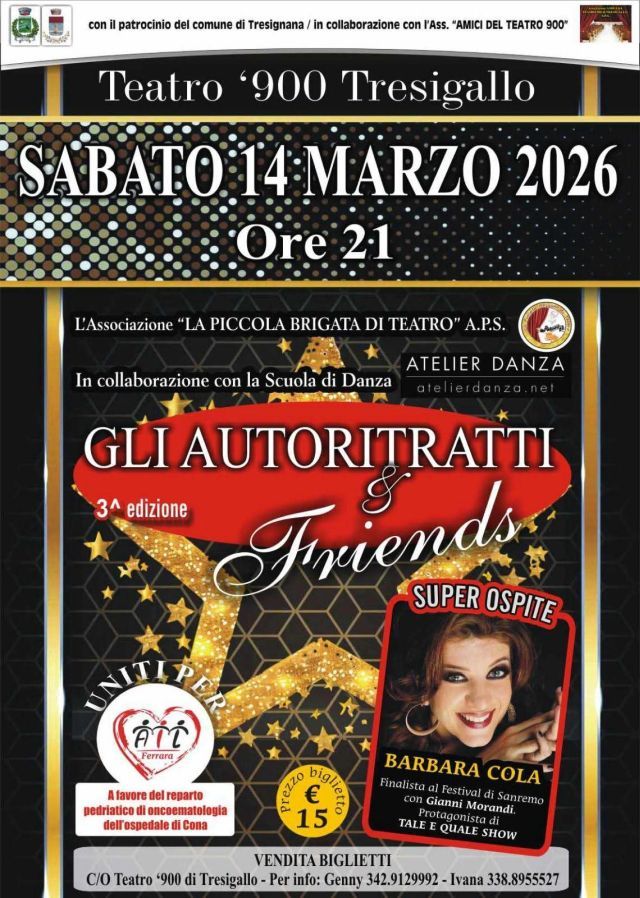 Sabato 14 marzo, ore 21, Teatro ‘900, Tresigallo, l’associazione “La Piccola Brigata” A.P.S. in collaborazione con la Scuola di Danza “Atelier Danza” propone la 3° edizione dello spettacolo “Gli Autoritratti & Friends” a sostegno di AIL – Associazione contro le Leucemie, Linfoma e Mieloma.