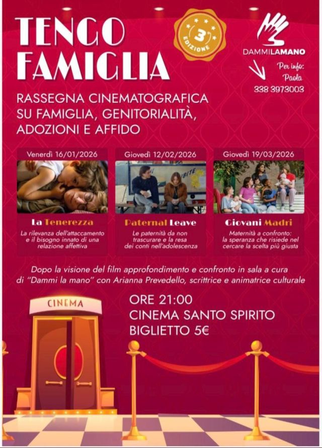 “Tengo famiglia”, rassegna cinematografica promossa dall’Associazione Dammi la mano con tre appuntamento al Cinema Santo Spirito, via della Resistenza 7 a Ferrara, ore 21, venerdì 16 gennaio, giovedì 12 febbraio e 19 marzo 2026.