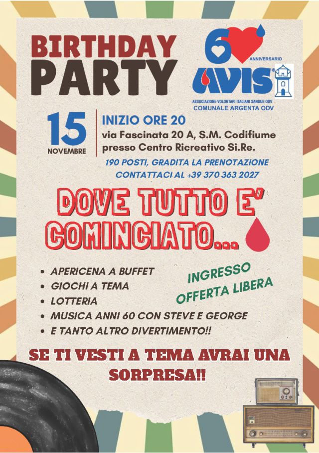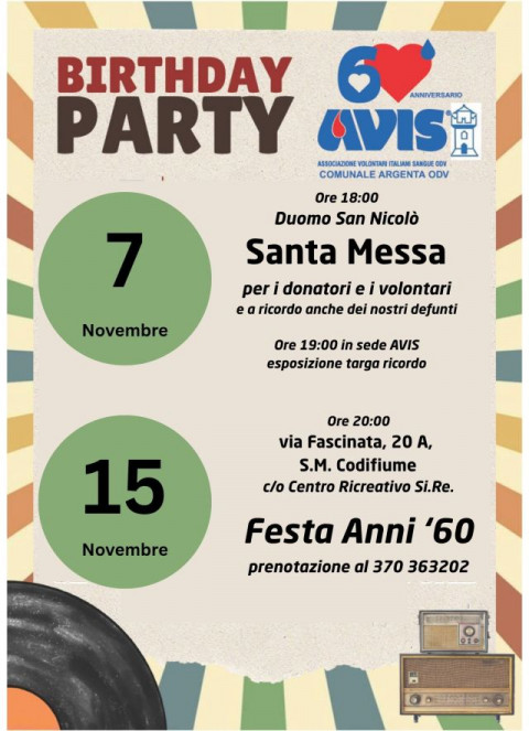 Venerdì 7 e sabato 15 novembre il Birthday Party per il 60° Anniversario di Avis Argenta.