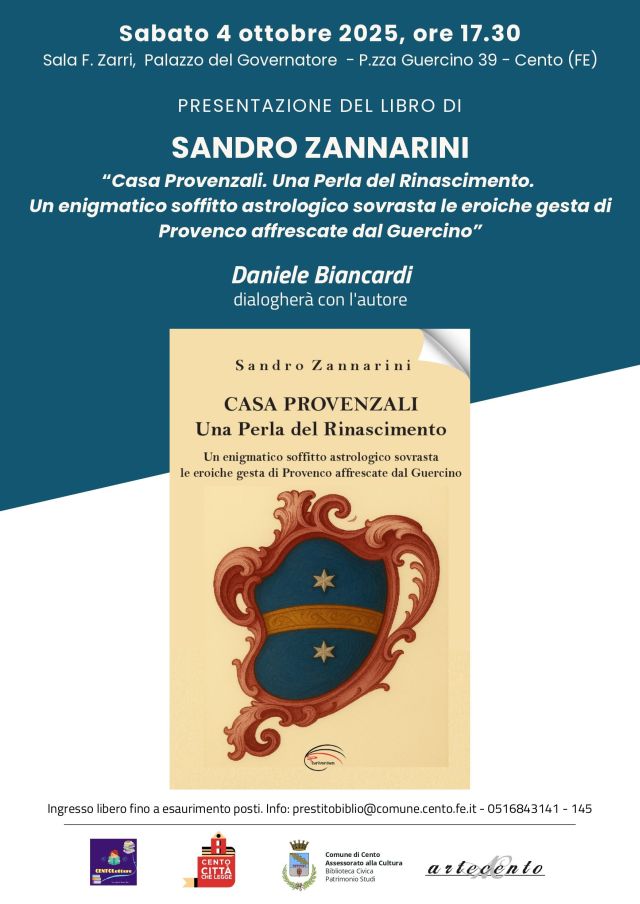 Sabato 4 ottobre 2025 alle 17.30 presso il Palazzo del Governatore di Cento, sala F. Zarri, verrà presentata la nuova pubblicazione di Sandro Zannarini  Casa Provenzali. Una Perla del Rinascimento. Un enigmatico soffitto astrologico sovrasta le eroiche gesta di Provenco affrescate dal Guercino. Nel corso dell’incontro Daniele Biancardi dialogherà con l’autore.