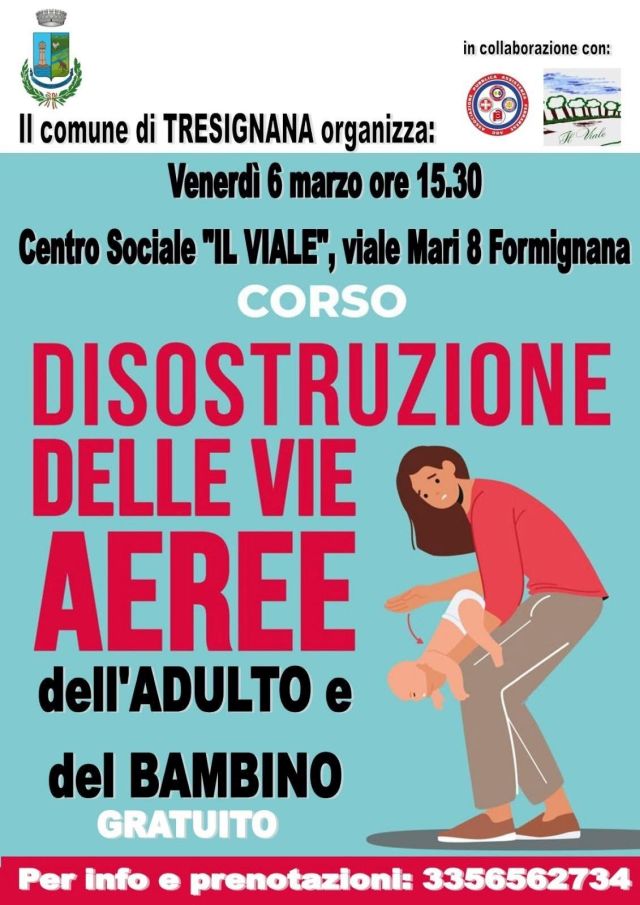 Venerdì 6 marzo, ore 15.30, il Comune di Tresignana in collaborazione con Il Viale Aps organizza un corso gratuito di “Disostruzione delle vie aeree dell’adulto e del bambino” presso Il Viale , viale mari 8 a Formignana.