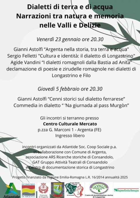 Atlantide Soc. Coop Sociale p.a. in collaborazione con Comune di Argenta, associazione ARS Ricerche storiche di Consandolo, GAT Gruppo Attività Teatrali di Consandolo e Centro di documentazione storica di Longastrino organizzano due incontri “Dialetti di terra e di acqua – Narrazioni tra natura e memoria nelle Valli e Delizie venerdì 23 gennaio e giovedì 5 febbraio, ore 20.30, presso il Centro Culturale Mercato, Piazza Marconi 1 ad Argenta (FE). Ingresso libero
