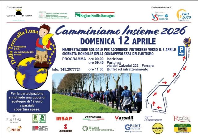 Testimoniare passo passo la sensibilità di una comunità che ogni anno – in occasione della ‘Giornata Mondiale della Consapevolezza dell’Autismo’, istituita il 2 aprile – si ritrova per manifestare la propria vicinanza alle persone con autismo e alle loro famiglie. Domenica 12 aprile 2026 dalle 9:45 (con ritrovo alle ore 9) scatterà dalla sede della Fondazione Dalla Terra Alla Luna di Malborghetto di Boara (via Calzolai, 223), l’8a edizione della manifestazione “Camminiamo Insieme”, la camminata non competitiva di circa 3,5km promossa per sensibilizzare la popolazione sull’autismo e realizzare una raccolta fondi da destinare alle attività realizzate dalla realtà sociale.