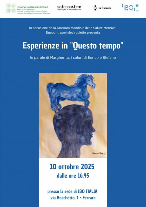 In occasione della Giornata Mondiale della Salute Mentale, venerdì 10 ottobre, dalle 16.45 presso la sede di IBO Italia, via Boschetto 1 a Ferrara, Associazione Duepuntiapertevirgolette presenta Esperienze in “Questo tempo”: le parole di Margherita, i colori di Enrico e Stefano.