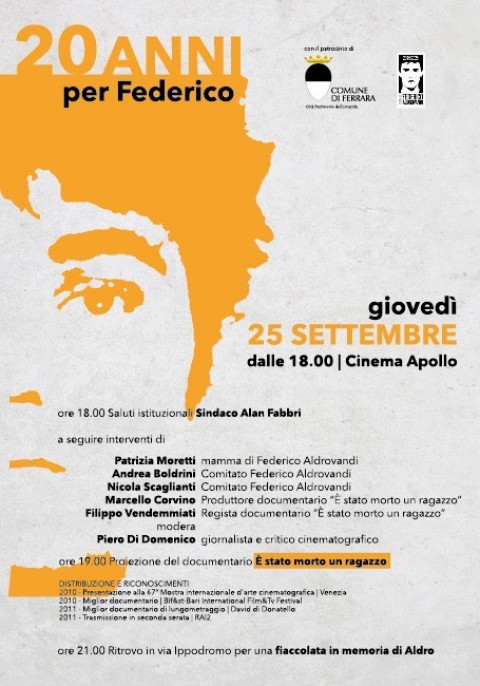 – Cinema Apollo a partire dalle 18 (ingresso gratuito) – La sera al Cinepark Apollo, verrà proiettato il film documentario vincitore del David di Donatello 2011 “È stato morto un ragazzo” diretto da Filippo Vendemmiati (ore 19), preceduto alle 18 dagli interventi dell’autore e di Alan Fabbri, sindaco di Ferrara, Patrizia Moretti, madre di Federico, del produttore del film, Marcello Corvino, assieme al critico cinematografico Piero Di Domenico.