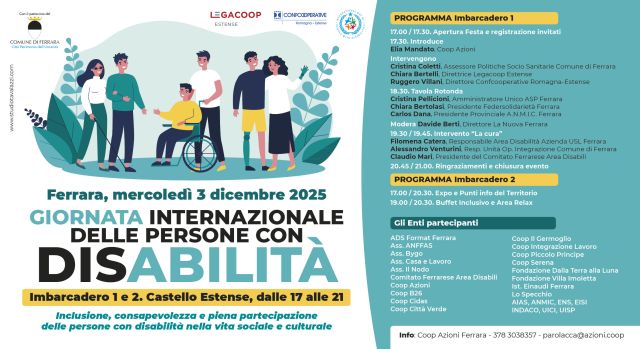 Mercoledì 3 dicembre, dalle 17 alle 21 presso Imbarcadero 1 e 2, Castello Estense, Ferrara, si svolgerà un convegno evento organizzato da Legacoop Estense e Confcooperative Romagna-Estense che vedrà diverse voci delle organizzazioni del terzo settore e delle istituzioni ferraresi su inclusione, consapevolezza e piena partecipazione delle persone con disabilità nella vita sociale e culturale.