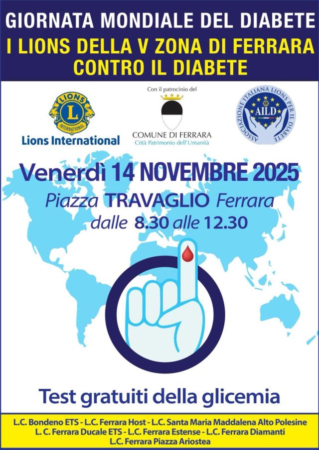 Nella ricorrenza della “Giornata Mondiale del Diabete”, i club lionistici ferraresi giocano di squadra per anticipare la patologia. Venerdì 14 novembre 2025 dalle 8:30 alle 12:30 in piazza Travaglio, a Ferrara, infatti, la cittadinanza potrà sottoporsi a test gratuiti per misurare il valore glicemico del sangue.