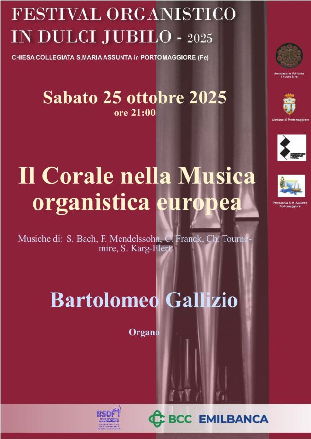 Sabato 25 ottobre, alle ore 21, sesto appuntamento presso la Chiesa Collegiata S. Maria Assunta di Portomaggiore (Fe) con il Festival Organistico IN DULCI JUBILO edizione 2025