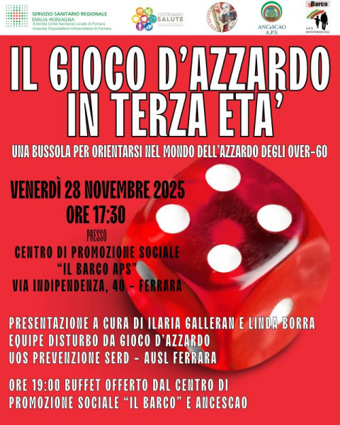 Venerdì 28 novembre, ore 17.30, presso Centro Il Barco Aps, via Indipendenza 40, Ferrara, presentazione a cura di Ilaria Galleran e Linda Borra, equipe disturbo da gioco d’azzardo, UOS Prevenzione SERD – AUSL Ferrara