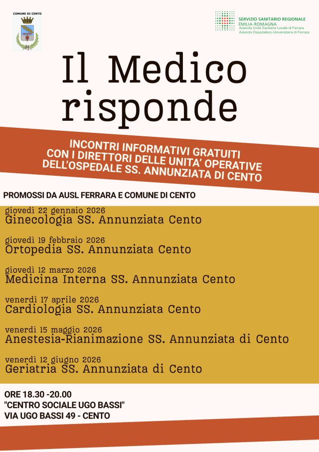Continua, a Cento, il ciclo di incontri informativi gratuiti “Il medico risponde”, promosso dal Comune di Cento e dall’Azienda USL di Ferrara, che vede come protagonisti gli specialisti dell’Ospedale SS. Annunziata.