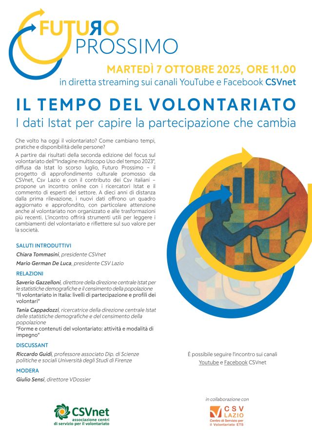Che volto ha oggi il volontariato? Come cambiano tempi, pratiche e disponibilità delle persone? A partire dai risultati della seconda edizione del focus sul volontariato dell’“Indagine multiscopo Uso del tempo 2023”, diffusa da Istat lo scorso luglio, Futuro Prossimo – il progetto di approfondimento culturale promosso da CSVnet, Csv Lazio e con il contributo dei Csv italiani – propone un incontro online con i ricercatori Istat e il commento di esperti del settore. A dieci anni di distanza dalla prima rilevazione, i nuovi dati offrono un quadro aggiornato e approfondito, con particolare attenzione anche al volontariato non organizzato e alle trasformazioni più recenti. L’incontro offrirà strumenti utili per leggere i cambiamenti del volontariato e riflettere sul suo valore per la società.