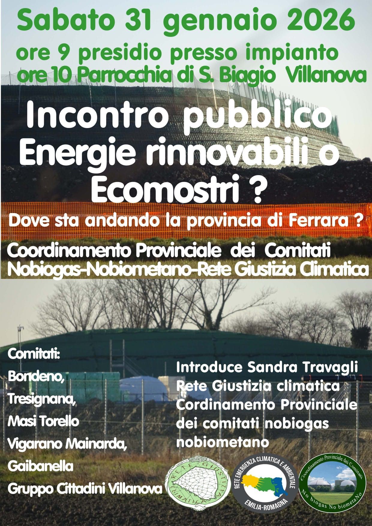 Sabato 31 gennaio il Coordinamento provinciale dei Comitati Nobiogas-Nobiometano-rete Giustizia Climatica organizzano ore 9 presidio presso impianto di Villanova (Fe) e ore 10 incontro pubblico presso la Parrocchia di San Biagio a Villanova (Fe).