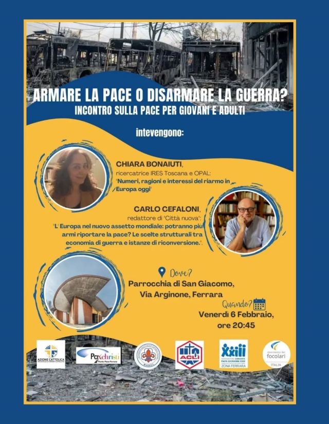 “Armare la pace o disarmare la guerra?” è il titolo dell’incontro in programma Venerdì 6 febbraio, ore 20.45, presso Parrocchia di San Giacomo, Via Arginone, Ferrara.