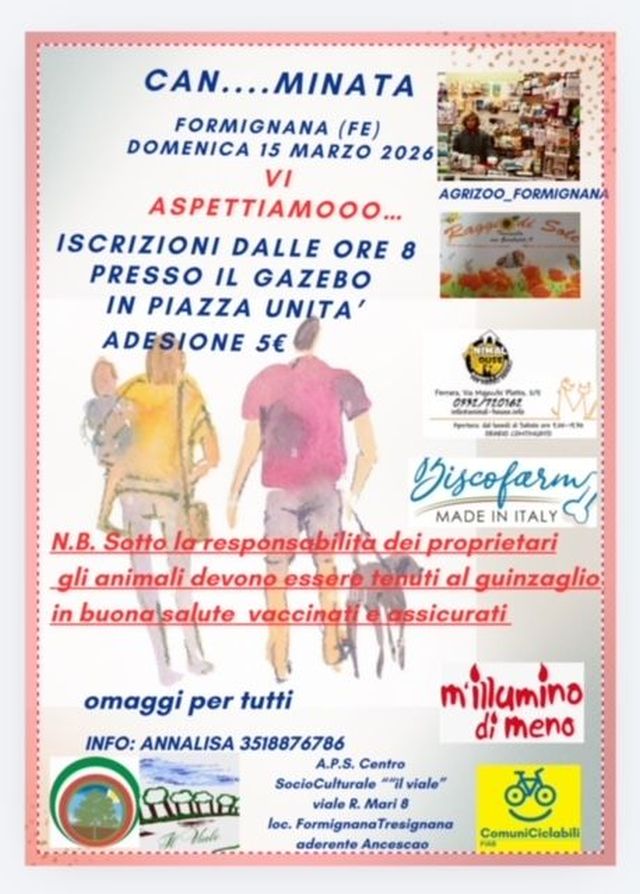 Domenica 15 marzo, tutti a “can…minare” con i propri cari pelosi al guinzaglio, con iscrizioni a partire dalle ore 8 presso il gazebo in Piazza Unità a Formignana.