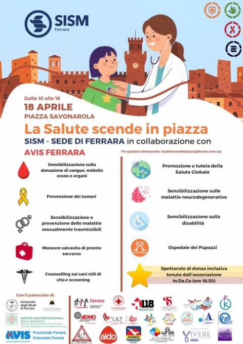 Sabato 18 aprile 2026 dalle 10:00 alle 18:00, piazza Savonarola accoglierà una nuova edizione de ‘La Salute Scende in Piazza’, la manifestazione dedicata all’ambito sociosanitario promossa dal Segretariato Italiano Studenti in Medicina (Sism) in sinergia con le Avis Provinciale e Comunale, e il patrocinio dell’Assessorato alle Politiche Sociosanitarie del Comune di Ferrara e delle Aziende Sanitarie Ferraresi. Sono 20 le associazioni aderenti, che saranno in piazza per promuovere un’iniziativa che porta la promozione della salute nel centro cittadino. Nei gazebo allestiti dalle associazioni verranno proposte attività gratuite per ogni età, ma anche divulgati materiali informativi per favorire consapevolezza nei cittadini.