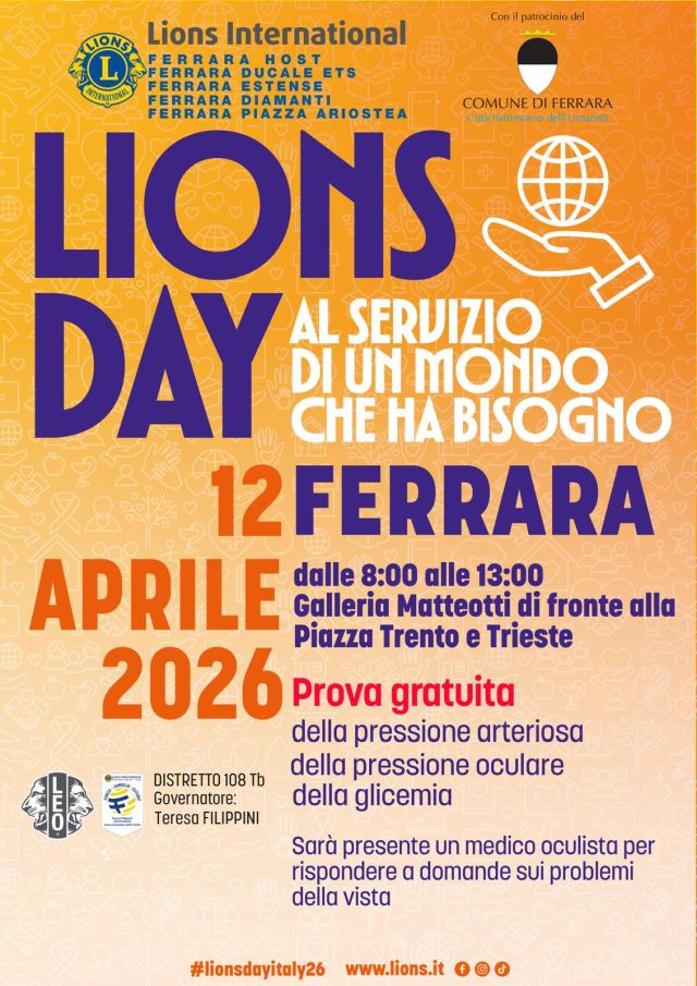 Un fine settimana all’insegna della musica, della solidarietà e della salute sta per animare il cuore di Ferrara. Con lo slogan “Al servizio di un mondo che ha bisogno”, i Lions tornano in piazza con il tradizionale Concerto della Pace e Lions Day, trasformando il centro storico estense in un punto d’incontro per la comunità, tra emozioni, prevenzione e impegno concreto per il benessere. Sono 7 i Lions Club del territorio che saranno in piazza, venerdì 10 aprile e domenica 12 aprile, con i propri volontari, con l’intento di creare aggregazione e promuovere sensibilità nei confronti della cittadinanza. Dei 7 club, 5 sono cittadini (Ferrara Host, Ferrara Ducale Ets, Ferrara Estense, Ferrara Diamanti e Ferrara Piazza Ariostea), a cui si aggiungono il Lions Club Bondeno Ets e il Lions Club Santa Maria Maddalena – Alto Polesine.