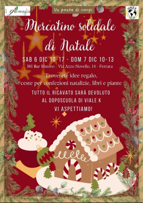 Sabato 6 dicembre, dalle 10 alle 17, e domenica 7 dicembre, dalle 10 alle 13, presso 381 Bar Ristoro, in via Azzo Novello 14 a Ferrara, La Cooperativa sociale Il germoglio, Un ponte di corpi e Viale K organizzano il Mercatino di Natale con idee regalo, ceste per confezioni natalizie, libri e piante. Il ricavato sarà devoluto a sostegno del Doposcuola gestito da Viale K Odv.