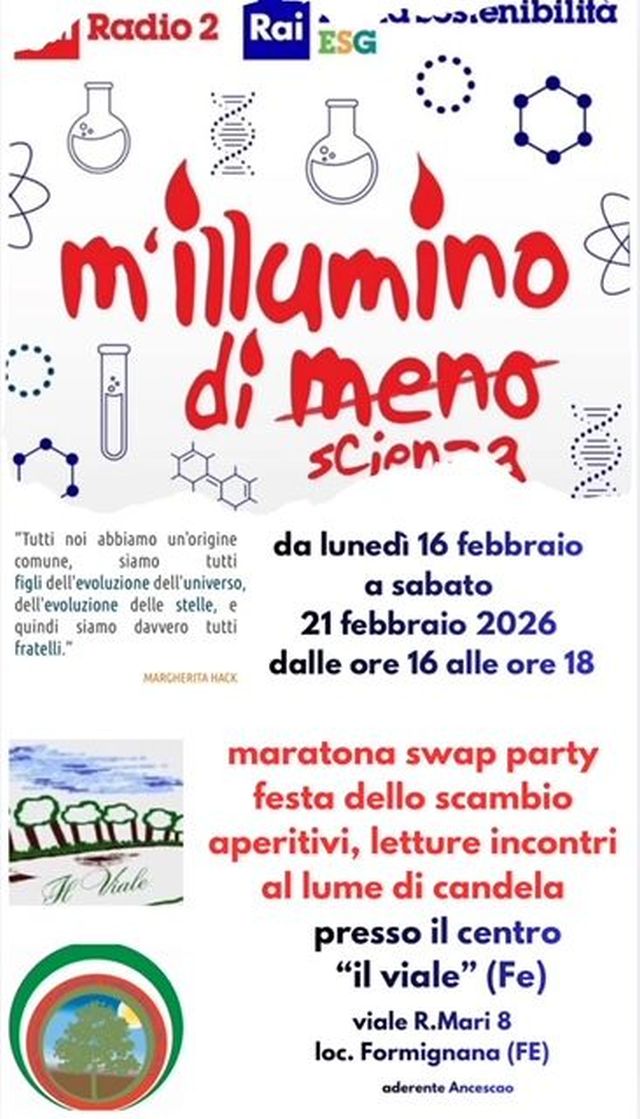 Da lunedì 16 a sabato 21 febbraio, dalle 16 alle 18, maratona swap party, festa dello scambio, aperitivi, letture incontri al lume di candela presso il Centro Ancescao “Il Viale”, viale R. Mari 8, loc. Formignana (Fe).