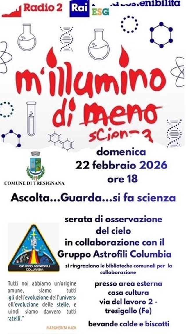 Domenica 22 febbraio, ore 18 presso Area esterna Casa Cultura, via del Lavoro 2, Tresigallo (FE), “Ascolta…Guarda…si fa scienza”, serata di osservazione del cielo in collaborazione con il Gruppo Astrofili Columbia.