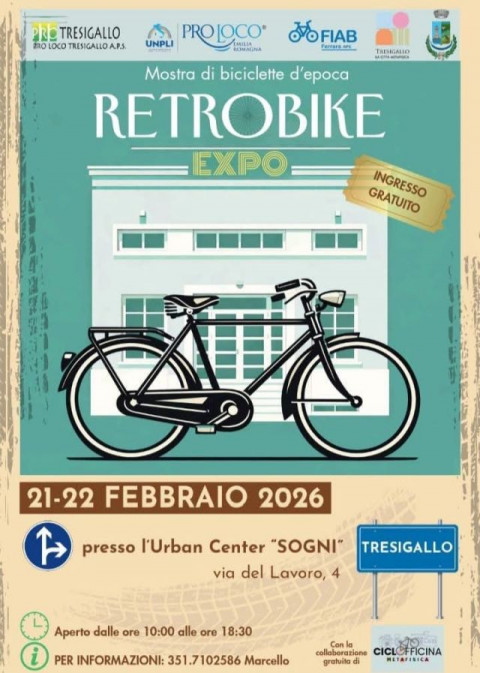 Sabato e domenica 21-22 febbraio, dalle 10 alle 18.30 presso l’Urban Center “Sogni”, via del Lavoro 4, Tresigallo. Promuovono l’iniziativa Pro Loco Tresigallo APS, Pro Loco Emilia Romagna, UNPLI, FIAB Ferrara con la collaborazione di Ciclofficina Metafisica. Ingresso gratuito