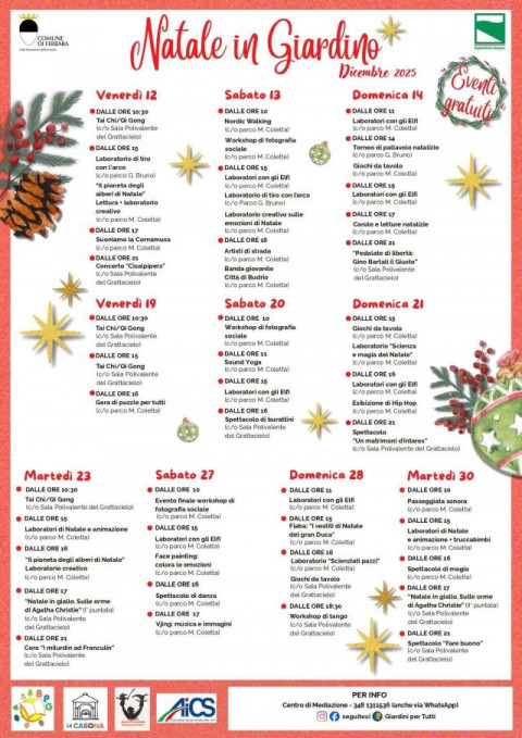 “Il tempo della festa” si inserisce all’interno di “Natale in Giardino”, iniziativa promossa dal @Comune di Ferrara, in collaborazione con la @Regione Emilia-Romagna e curata da: @La Casona, @Biblioteca Popolare Giardino, @Compagnia Gad Città di Ferrara e @Aics.