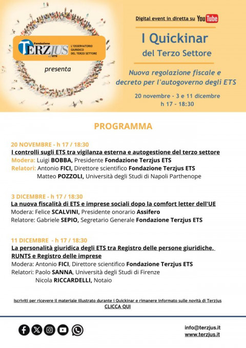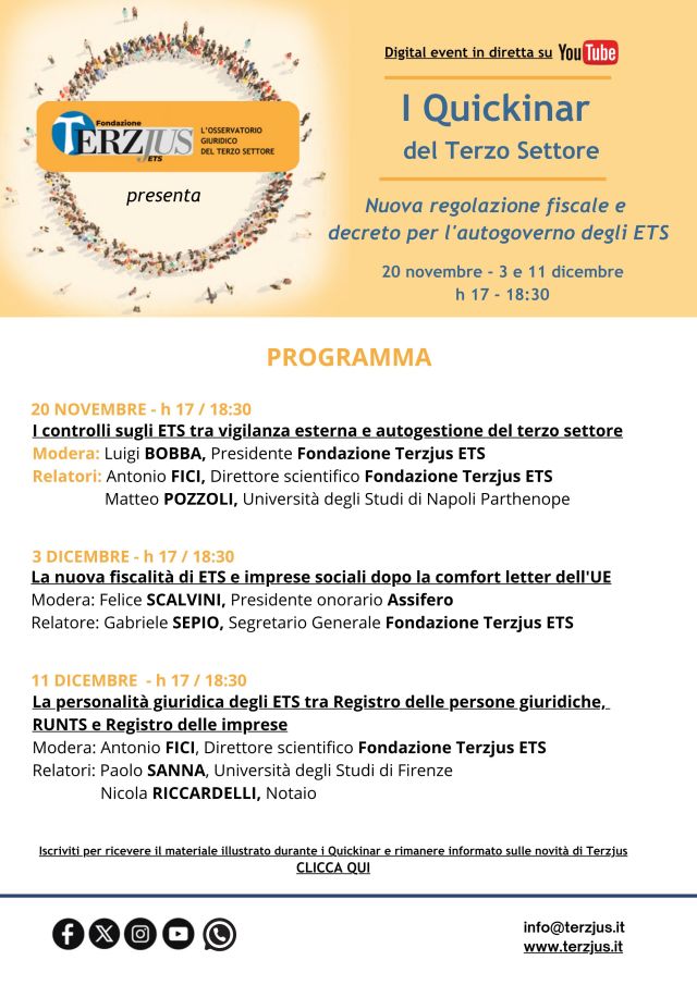 Fondazione Terzjus lancia il nuovo ciclo di Quickinar, una serie di webinar di circa un’ora dedicati alla formazione agile e smart sul Terzo Settore, che si svolgeranno in diretta streaming sul canale YouTube ufficiale di Terzjus. Dopo il successo delle edizioni precedenti, questa nuova sessione si concentrerà su temi di grande attualità come la nuova regolazione fiscale degli Enti del Terzo Settore (ETS), il decreto per l’autogoverno degli ETS e il Registro Unico Nazionale del Terzo Settore (Runts).