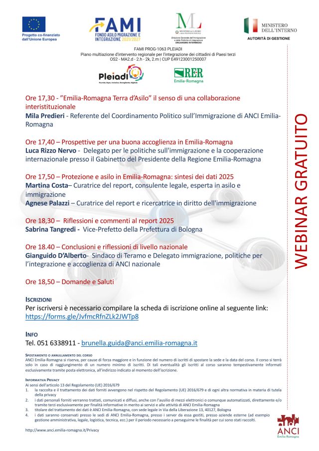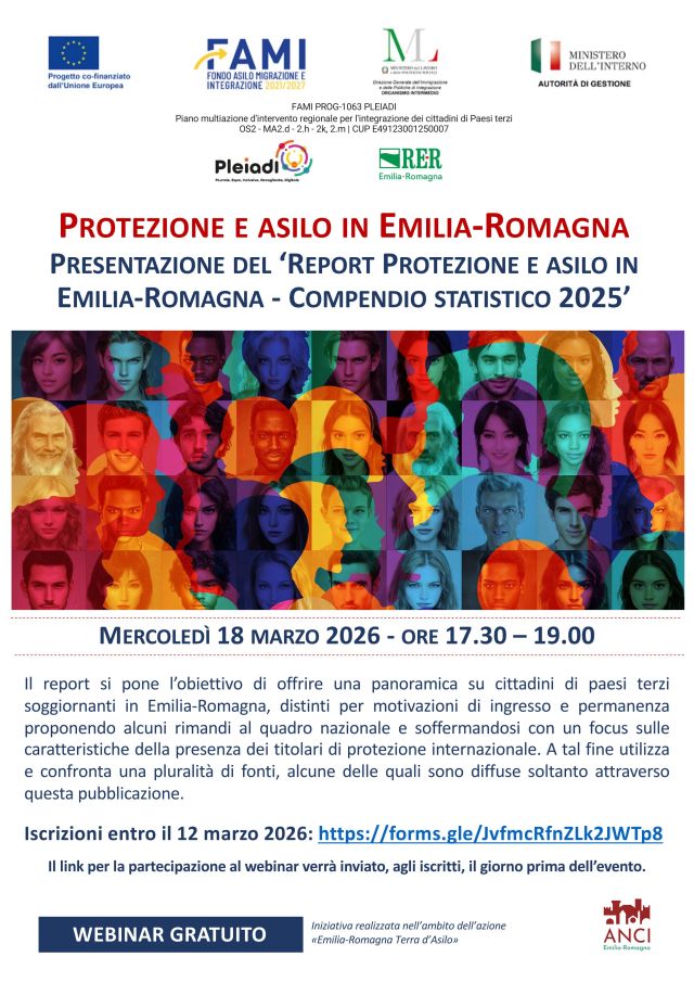 Mercoledì 18 marzo 2026 dalle ore 17.30–19.00 sarà presentato on line il nuovo Report “Protezione e asilo in Emilia-Romagna. Compendio statistico 2025” realizzato con Anci ER nell’ambito del progetto FAMI PROG-1063 PLEIADI Piano multiazione d’intervento regionale per l’integrazione dei cittadini di Paesi terzi.