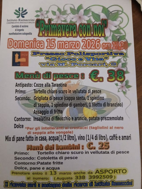 Domenica 15 marzo, ore 12.30, presso Polisportiva "Gioco e Vita", via M. Porcari 2, Argenta. Prenotazioni entro il 13 marzo