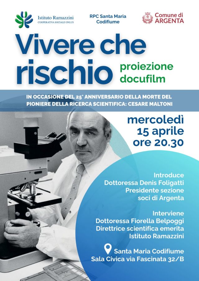 In occasione del 25° anniversario della morte del pioniere della ricerca scientifica Cesare Maltoni, mercoledì 15 aprile, ore 20.30, presso Sala Civica in via Fascinata 32/B a Santa Maria Codifiume, proiezione docufilm “Vivere che rischio”.