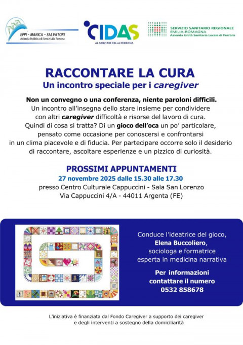 Giovedì 27 novembre, dalle 15.30 alle 17.30 presso Centro Culturale Cappuccini, Sala San Lorenzo, via Capuccini 4/A, Argenta, un incontro all’insegna dello stare insieme per condividere con altri caregiver difficoltà e risorse del lavoro di cura, un gioco dell’oca un po’ particolare, pensato come occasione per conoscersi e confrontarsi in un clima piacevole di fiducia.