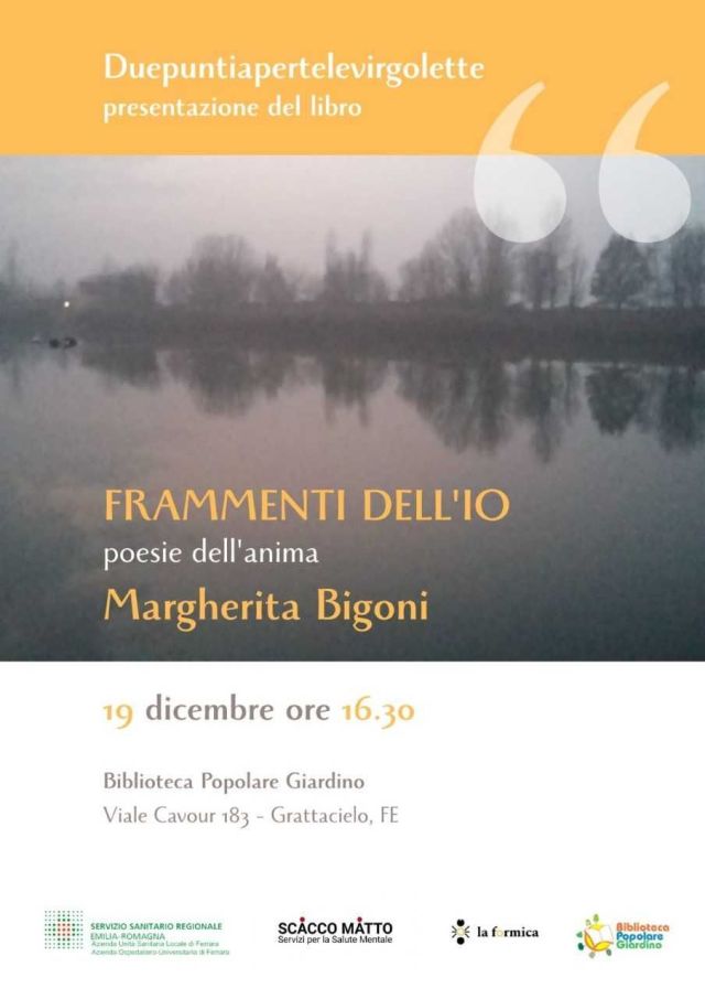 Venerdì 19 dicembre ore 16:30, presso la Biblioteca Popolare Giardino viale Cavour 183 Ferrara (ai piedi del grattacielo), Presentazione di “Frammenti dell’Io”, raccolta di poesie di Margherita Bigoni, nell’ambito del ciclo tematico su “Salute mentale e possibili percorsi di guarigione”, promosso da Duepuntiapertelevirgolette e sostenuto da Biblioteca Popolare Giardino, Aziende Sanitarie di Ferrara, Scaccomatto e Associazione la Formica.