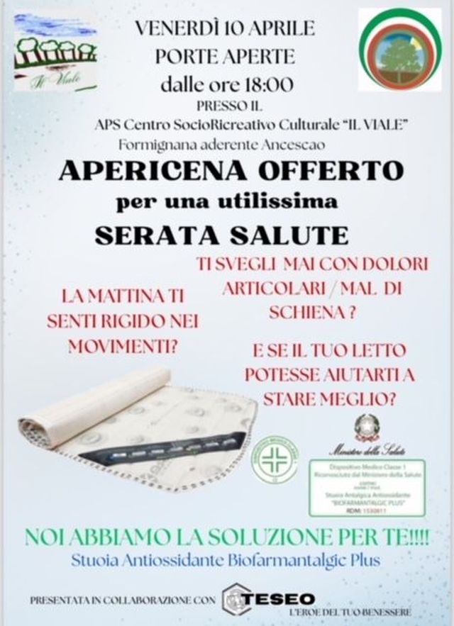 Venerdì 10 aprile, dalle ore 18 presso Il Centro Socioricreativo Culturale “Il Viale” Aps, aderente Ancescao, viale Mari 8 a Formignana, apericena offerto per una serata salute con sponsor dedicata al benessere articolare.
