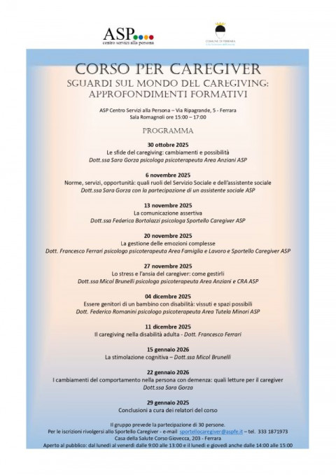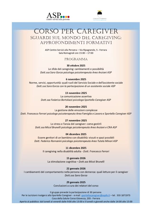 er le iscrizioni rivolgersi allo Sportello Caregiver, presso la Casa di Comunità Cittadella San Rocco di corso Giovecca, 203 (telefono 333 1871973 / sportellocaregiver@aspfe.it).