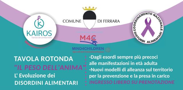 Venerdì 28 novembre, dalle 9.30 alle 13 e dalle 14.30 alle 18, presso Sala della Musica, via Boccaleone 19 a Ferrara, l’Associazione Kairos Il tempo dei cambiamenti organizza la tavola rotonda “Il peso dell’anima” – l’Evoluzione dei disordini alimentari.
