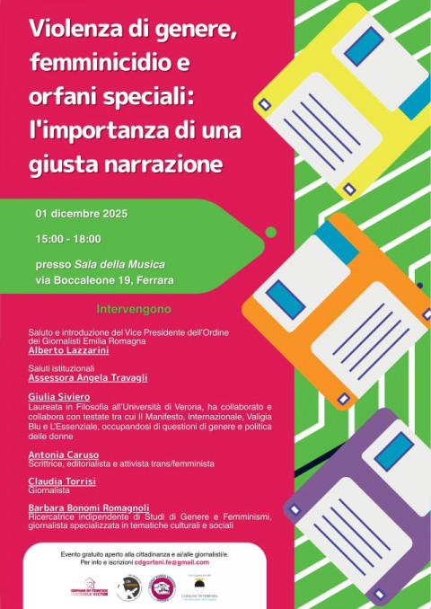 Lunedì 1 dicembre, ore 15 – 18, presso Sala della Musica, via Boccaleone 19 a Ferrara, evento gratuito aperto alla cittadinanza dal titolo “Violenza di genere, femminicidio e orfani speciali: l’importanza di una giusta narrazione”.