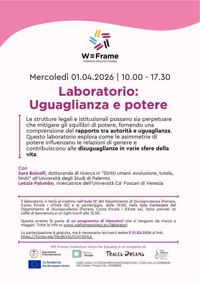 C.D.S. Cultura OdV vi invita a partecipare ai cinque laboratori tematici che si svolgeranno in presenza a Ferrara da marzo a maggio e che rientrano nelle azioni del progetto europeo WE Frame: Collective Views for Equality (WE Frame: Opinioni collettive per l’uguaglianza), finanziato nell’ambito della Call europea CERV-2024-CITIZENS-RM- EUINTEGRATION, GA No. 101196808 e realizzato in collaborazione con i partner: Officine Europa, Traces & Dreams e Università degli Studi di Ferrara, capofila del progetto