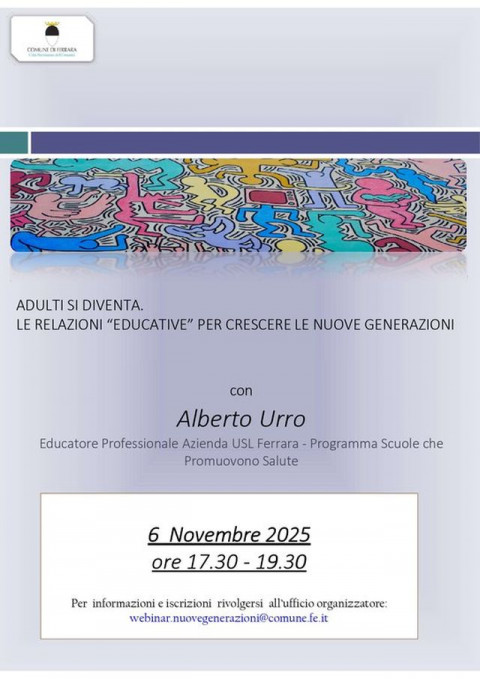 UO Nuove Generazioni organizza il prossimo webinar per genitori con figli adolescenti che si terrà giovedì 6 novembre 2025 dalle ore 17.30 alle 19.30 dal titolo “ Adulti si diventa.Le relazioni ”Educative” per crescere le nuove generazioni” condotto dall’ Educatore Professionale USL di Ferrara Alberto Urro.