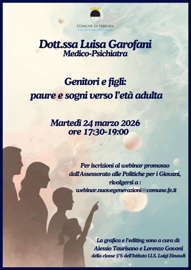 Martedì 24 marzo, ore 17.30-19. Si terrà il webinar “Genitori e figli: paure e sogni verso l’età adulta” a cura della dott.ssa Luisa Garofani, medico psichiatra. Iscrizioni: webinar.nuovegenerazioni@comune.fe.it