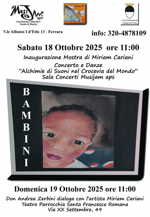 Un weekend all’insegna della collaborazione fra arti espressive di varia natura quello di sabato 18 e domenica 19 ottobre 2025 tra le sale di Musijam APS, presso il Centro Antonio Slavich in Viale Alfonso D’Este n° 13 e il Teatro della Parrocchia Santa Francesca Romana in via XX Settembre n° 47. Si comincia sabato 18 negli spazi espositivi e sale di musica dell’associazione culturale e scuola di musica Musijam: alle ore 11 sarà inaugurata la mostra BAMBINI, una serie di suggestivi ritratti realizzati da Miriam Cariani, immagini di bambini riprese da alcune istantanee scattate nel 2022 dall’artista, che nello svolgimento del lavoro di operatrice interculturale si trova spesso ad essere a contatto con adulti e minori provenienti da varie parti del mondo. «Incontri fugaci, ma intensi – si legge nel testo di presentazione della mostra in una precedente occasione – che mi hanno permesso di entrare in empatia con tanti di loro, specialmente bambini e bambine piccoli, arrivati in Italia o nati qui, ma comunque definiti spesso stranieri o rifugiati e chiamati erroneamente clandestini come i loro genitori quando non possiedono un permesso di soggiorno». I ritratti sono stati realizzati con la tecnica dell’acquerello e riprodotti su stampa. Nella produzione artistica di Miriam si riflettono aspetti, obiettivi e caratteristiche della sua formazione: laurea presso il Dipartimento di arte musica e spettacolo – DAMS di Bologna; diploma alla scuola triennale per le nuove artiterapie, specializzazione in medicina delle emarginazioni, delle migrazioni e della povertà. L’artista dichiara di volere, oggi, usare il processo creativo come strumento di cura e narrazione, anche nell’ambito del suo lavoro quotidiano.