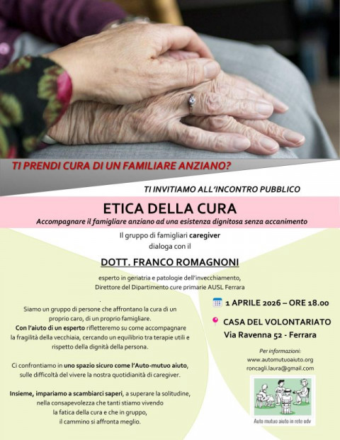 Mercoledì 1 aprile, ore 18 presso la Casa del Volontariato di Ferrara, via Ravenna 52, il gruppo di auto aiuto famigliari caregiver, che fa parte della rete ferrarese delle realtà di auto mutuo aiuto, dialoga con il Dott. Franco Romagnoni, esperto in geriatria e patologie dell’invecchiamento, Direttore del Dipartimento cure primarie Ausl Ferrara.