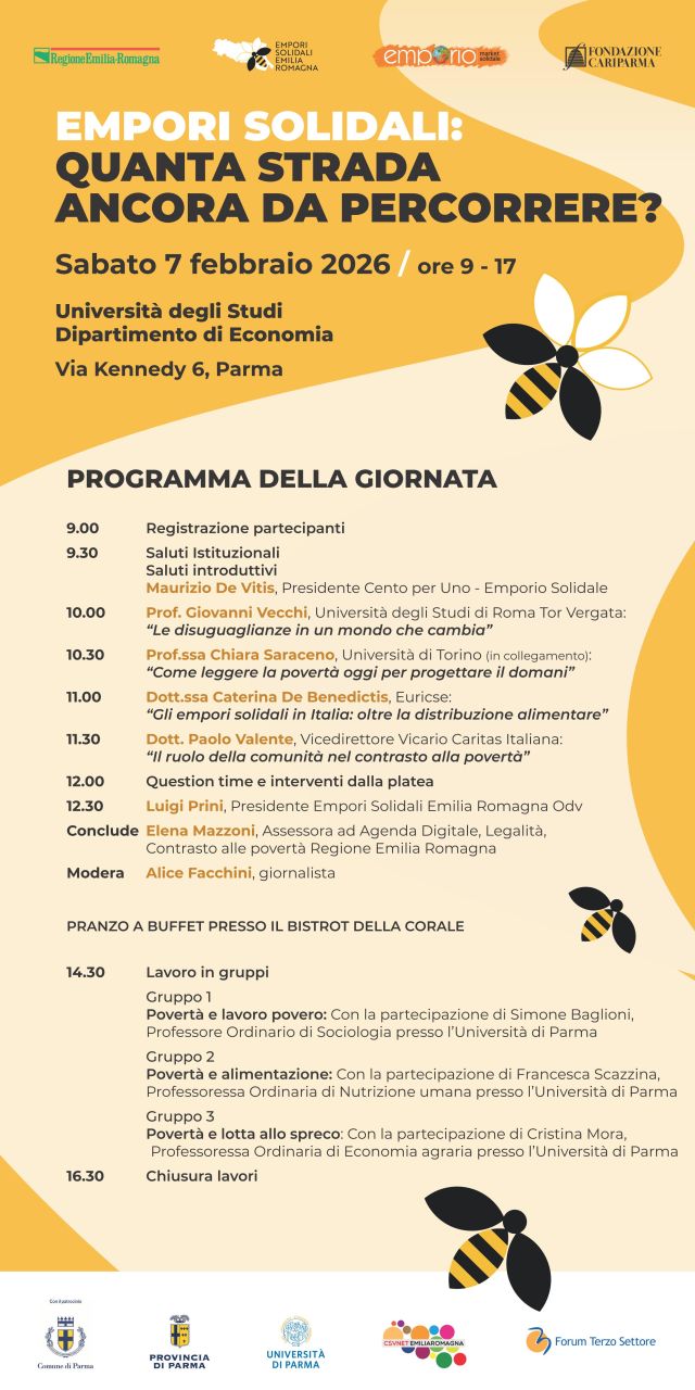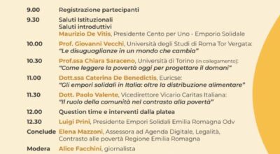 Un’intera giornata, dalle 9 alle 17, presso il Dipartimento di Economia dell’Università degli Studi di Parma in via Kennedy 6, articolata in panel di esperti al mattino e workshop nel pomeriggio. La sessione mattutina, moderata dalla giornalista Alice Facchini, vedrà la partecipazione del Prof. Giovanni Vecchi, Università degli Studi di Roma Tor Vergata, che affronterà il tema delle disuguaglianze in un mondo in trasformazione; della Prof.ssa Chiara Saraceno, Università di Torino, che interverrà in videocollegamento su come leggere la povertà oggi per poter progettare il domani; della Dott.ssa Caterina De Benedictis, Euricse, che presenterà una riflessione sugli empori solidali in Italia, guardando oltre la sola distribuzione alimentare. Il Dott. Paolo Valente, Vicedirettore Vicario Caritas Italiana approfondirà il ruolo della comunità nel contrasto alla povertà. Concluderà la mattinata Elena Mazzoni, Assessora ad Agenda Digitale, Legalità, Contrasto alle povertà Regione Emilia Romagna.