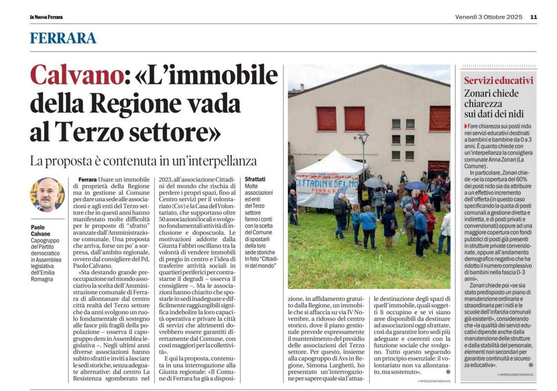 Calvano: “L’immobile della Regione vada al terzo settore” – 03.10.2025 – La Nuova Ferrara