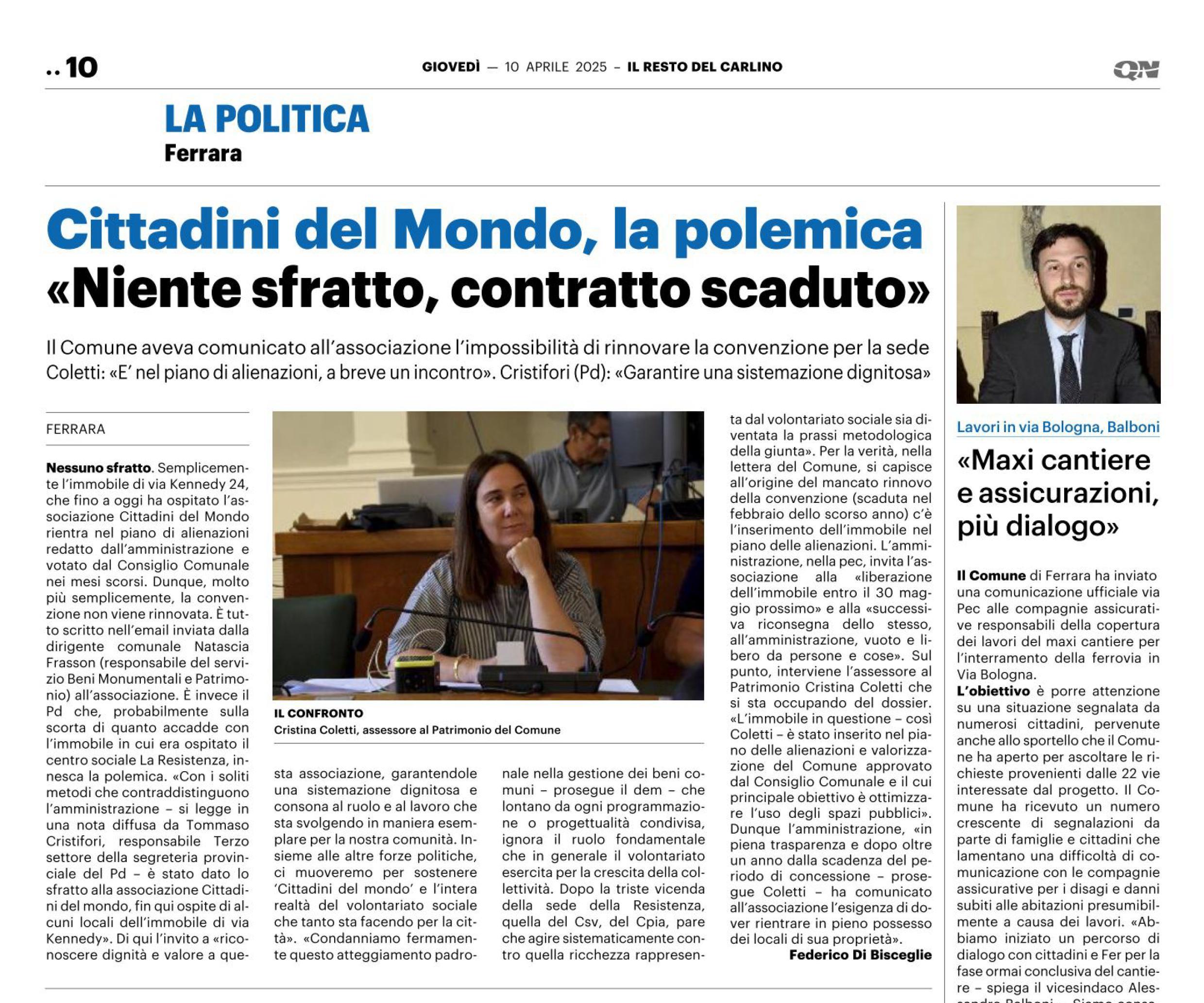Cittadini del mondo, la polemica. “Niente sfratto, contratto scaduto” – 10.04.2025 – Il Resto del Carlino Ferrara